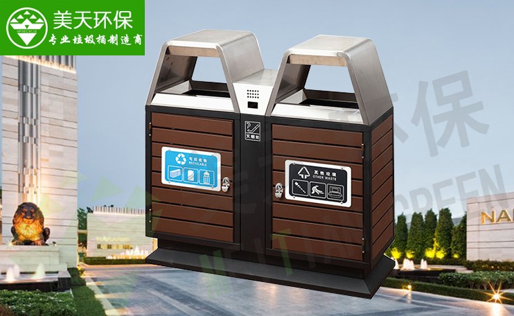 咨詢熱線:4008-787-781。美天環(huán)保這一款鋼木垃圾桶是一款環(huán)保分類垃圾桶,采用鍍鋅板和優(yōu)質(zhì)防腐木加工制作而成。適用于景區(qū)、公園、校園、街道等公共場(chǎng)所。